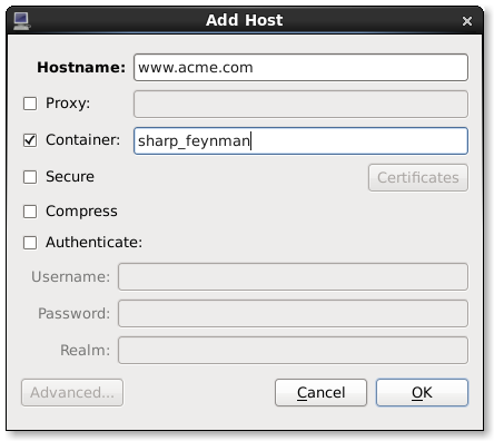 In the PCP strip chart utility pmchart from version 3.10.3 onward, connections to containers can be established using the "Add Host" dialog, as shown to the left. This can be accessed via the "New Chart" or "Open View" menu entries.