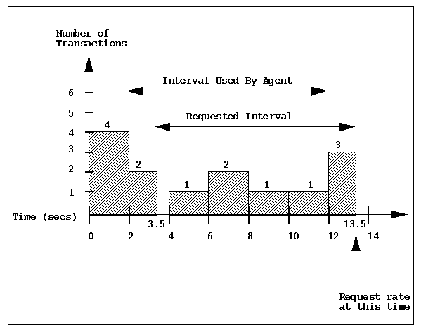 As mentioned above, the trace agent does not actually do this. It instead does its calculations automatically at a subinterval of the sampling interval. Consider the example above with a calculation subinterval of 2 seconds. Please refer to the bar chart below. At time 13.5 secs the user requests the transaction rate and is told it is has a value of 0.7 transactions per second. In actual fact, the transaction rate was 0.8 but the agent has done its calculations on the sampling interval from 2 secs to 12 secs and not from 3.5 secs to 13.5 secs. Every 2 seconds it will do the metrics calculations on the last 10 seconds at that time. It does this for efficiency and so it is not driven each time to do a calculation for a fetch request.